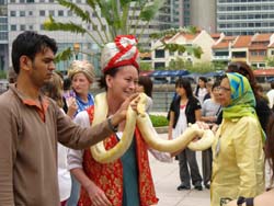 die Touristen werden animiert sich Schlangen um den Hals zu legen.