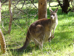 noch grasende Kängurus. Also kehren wir noch mal um und nähern uns zu Fuß den Tieren.